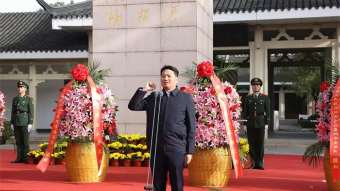 苍松翠柏掩映下的杨根思烈士陵园,格外静谧庄严,烈士塑像巍然屹立,《烈士纪念日号角》的旋律雄浑而悠远。姜冬冬、卢佩民、李晖、张小兵、周恒新、光华、秦猛、叶冬华、王永等市领导,泰州军分区大校政治委员潘东,以及社会各界群众代表在塑像前静静肃立。